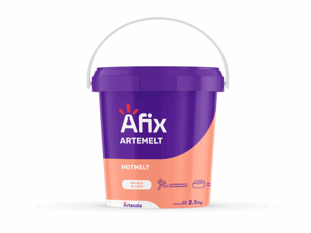 Adesivo hot melt termoplástico à base de etileno vinil acetato (EVA), resinas sintéticas, cargas minerais e aditivos especiais. Produto de coloração branca.